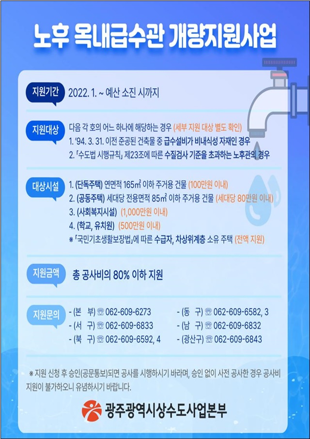 광주광역시 상수도사업본부가 깨끗한 수돗물을 공급하기 위해 단독주택 등에 설치된 노후 옥내급수관 개량공사비를 지원한다고 밝혔다.