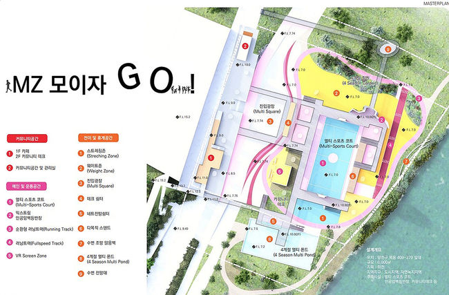 ‘안양천 목동교 하부 MZ스포츠플라자 조성’ 공모 당선작 “MZ 모이자 GO!”는 고가 하부 공간과 주변 도시와의 연계와 내부 공간 속 자유로운 흐름을 계획했다. 아울러 메인 공간인 복합스포츠 공간뿐만 아니라 주변의 서브 공간에도 주목해 공간 활성화를 도모했다. 웨이팅존, 스트레칭존, 정원공간 등의 서브존을 두텁게 조성해 메인 운동공간으로의 접근성과 활용도를 높였다.