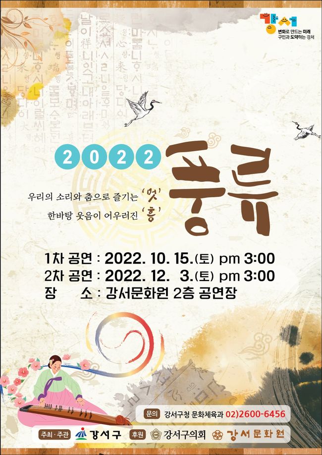 서울 강서구는 오는 10월 15일과 12월 3일 전통문화예술 공연 ‘풍류 2022’를 개최한다고 밝혔다.