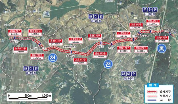두 사업 모두 5개년 사업으로 사업비는 지곡면 대요리, 화천리 일원의 원천지구는 380억 원(국비 190억 원, 도비 95억 원, 시비 95억 원), 해미면 홍천리 일원의 홍천지구는 250억 원(125억 원, 도비 62.5억 원, 시비 62.5억 원)으로 총 630억 원이다.