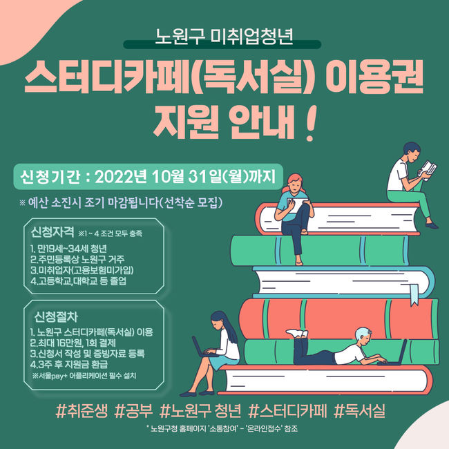 지원을 원하는 경우 오는 10월 31일까지 노원구청 홈페이지-소통참여-온라인 접수를 통해 신청서와 관련 서류를 접수하면 된다. 단, 대학(원) 재학생, 휴학생, 군 복무 중인 자, 상반기 ‘노원찬스3’ 중 스터디카페(독서실) 이용권 기지급자는 신청에서 제외된다.