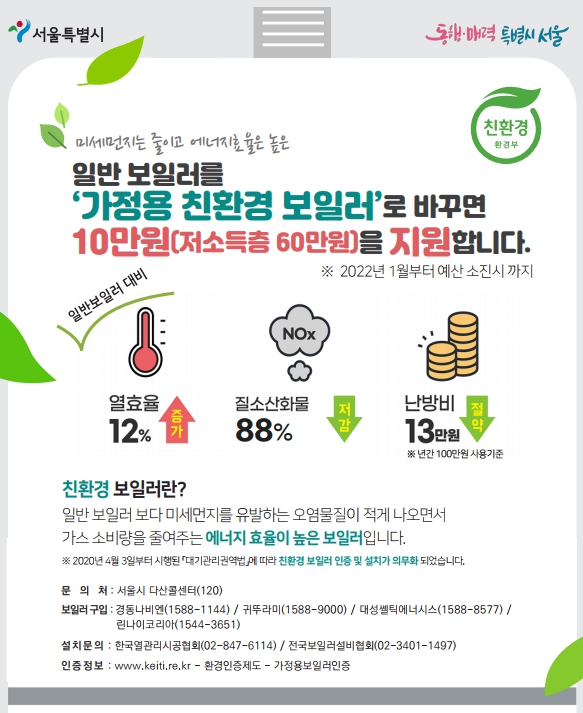 기존에는 제조 연도가 10년 이상 된 노후 보일러를 친환경보일러로 교체하는 구민에게만 보조금 지원을 했지만, 하반기부터는 2020년 4월 이전에 설치된 일반 가정용 보일러를 친환경보일러로 교체하거나 신규 설치하는 구민에게 보조금을 지원할 수 있도록 지원대상을 대폭 확대했다.