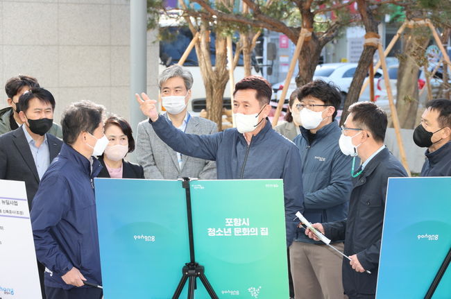이강덕 포항시장이 18일 중앙동 도시재생 뉴딜사업 거점시설로 조성 중인 꿈트리센터(청소년문화의집·청년창업플랫폼)를 방문해 건립 막바지 추진사항 및 현장 위험요소를 점검하고 관계자들을 격려했다.