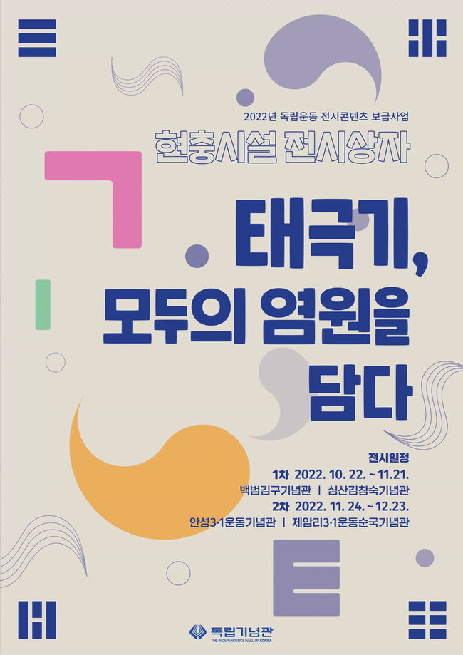 독립기념관은 독립운동을 다루는 현충시설과 함께 체험형 전시상자 순회전 [태극기, 모두의 염원을 담다]를 개최한다. 이번 순회전은 국가보훈처와 독립기념관이 현충시설 활성화를 위해 추진하는 사업으로, 기념관을 방문하는 국민들에게 독립운동의 현장마다 함께 했던 국가유산인 ‘태극기’를 살펴보고 체험하는 기회를 제공하고자 마련되었다.