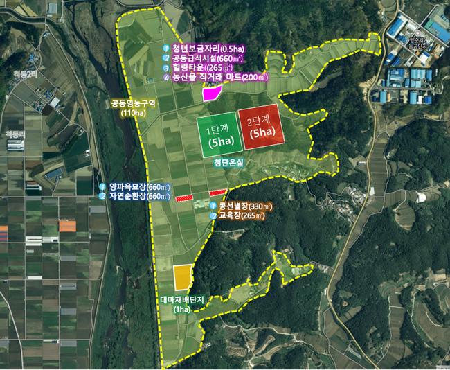 첨단농업단지내에는 임대형스마트팜, 임대형수직농장 및 곤충․양잠산업 거점단지 및 청년보금자리 등을 조성하고, 인근의 마을에는 공동영농화에 필요한 기반조성과 소득연계사업을 지원한다.