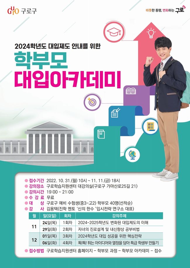 구로구, 학부모 대입 아카데미 개최 - 구로학습지원센터 대강당서 총 4회 강의 … 10.31~11.11 온라인으로 40명 선착순 모집