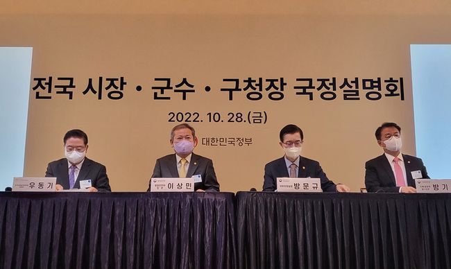 이상민 행정안전부 장관이 28일 오전 서울 용산구 전쟁기념관 내 피스앤파크에서 열린 `전국 시장 · 군수 · 구청장 국정설명회`에 참석해 시장 · 군수 · 구청장의 정책 건의에 답변을 하고 있다.