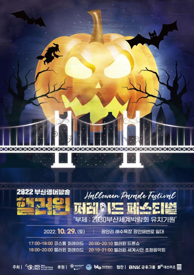 `2022 핼러윈 퍼레이드 페스티벌` 개최 - 10.29. 18:00 광안리 광안해변로 일대에서 개최… 부산영어방송재단 주최, 부산시 등 후원 - 핼러윈을 주제로 변장, 경연 행진 등 다채로운 시민 참여형 행진과 핼러윈 드론쇼, 세계 시민 음악회 등 특별 행사 펼쳐질 예정