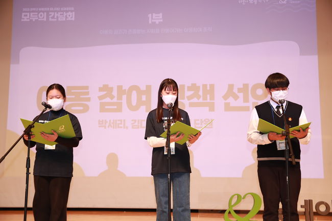 아동권리 모니터단 아동 참여 정책 선언을 하고 있는 아동들