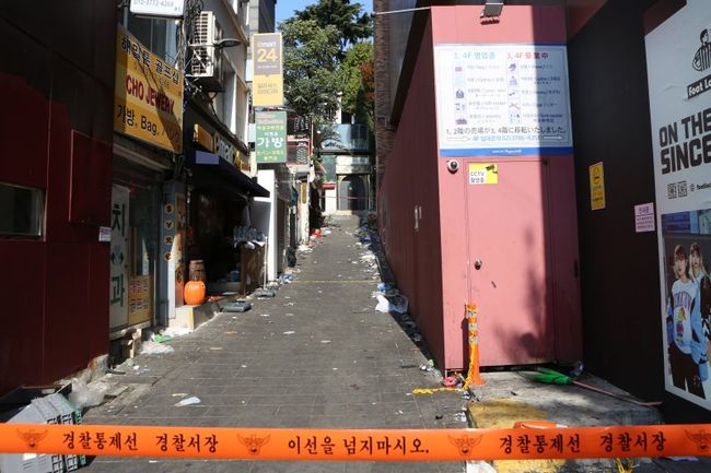 10월 29일 참사가 발생한 이태원 해밀턴 호텔 인근 골목길 입구에 경찰의 접근금지 줄이 쳐져 있다.