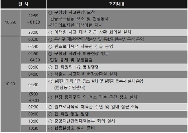 오전 10시에는 대통령 주재로 중앙재난안전대책본부 종합대책회의가 열렸다. 구는 중앙부처, 서울시, 소방, 경찰 등 유관기관과 유기적으로 사고 수습에 나섰다.