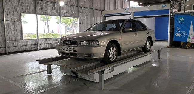 부천시가 연구개발한 국내 최초의 자율주행 주차로봇 `나르카`가 부천시 주차로봇 시험 주차장에서 승용차를 주차면으로 옮기고 있다.