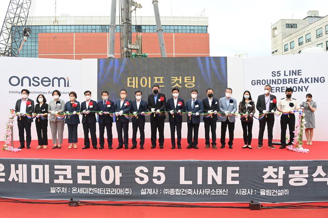 부천시를 비롯한 경기도, 온세미 등 3개 기관이 참여한 가운데 온세미코리아 본사에서 실리콘카바이드(SiC) 전력반도체 분야 공장라인을 증설하기 위한 착공식을 7월 7일 개최했다. 테이프 커팅식 진행 모습.