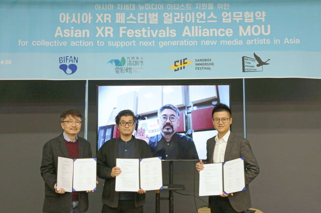 부천국제판타스틱영화제(BIFAN, 집행위원장 신철)는 가오슝영화제(대만)⋅샌드박스 이머시브 페스티벌(중국)⋅비욘드 더 프레임 페스티벌(일본)과 함께 아시아 차세대 뉴미디어 아티스트 지원을 위한 업무혐약을 28일 부천아트벙커B39에서 체결했다. 이날 업무 협약식에는 신철 BIFAN 집행위원장, 지미 쳉(Jimmy Cheng) 샌드박스 이머시브 페스티벌 국제 파트너십 이사, 가츠토시 마치바(Katsutoshi Machiba) 비욘드 더 프레임 페스티벌 공동설립자 겸 프로듀서, BIFAN의 김영덕 수석 프로그래머·김종민 XR 큐레이터·김준종 사무국장, 그리고 이용철 부천시 관광진흥과 과장 등 관계자 30여 명이 참석했다. 가오슝영화제를 대표해 황 하오지에(HUANG Haojie) 가오슝필름아카이브 디렉터가 온라인 화상회의 플랫폼을 통해 참여했다.