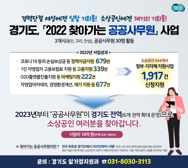 한편, 도는 지난달 25일 경기도일자리재단 여성능력개발본부(남부)에서 ‘2022 찾아가는 공공사무원 운영사업 성과보고회’를 개최, 추진실적을 발표하고, 우수 공공사무원 15명에 도지사 상장을 수여하는 시간을 가졌다.