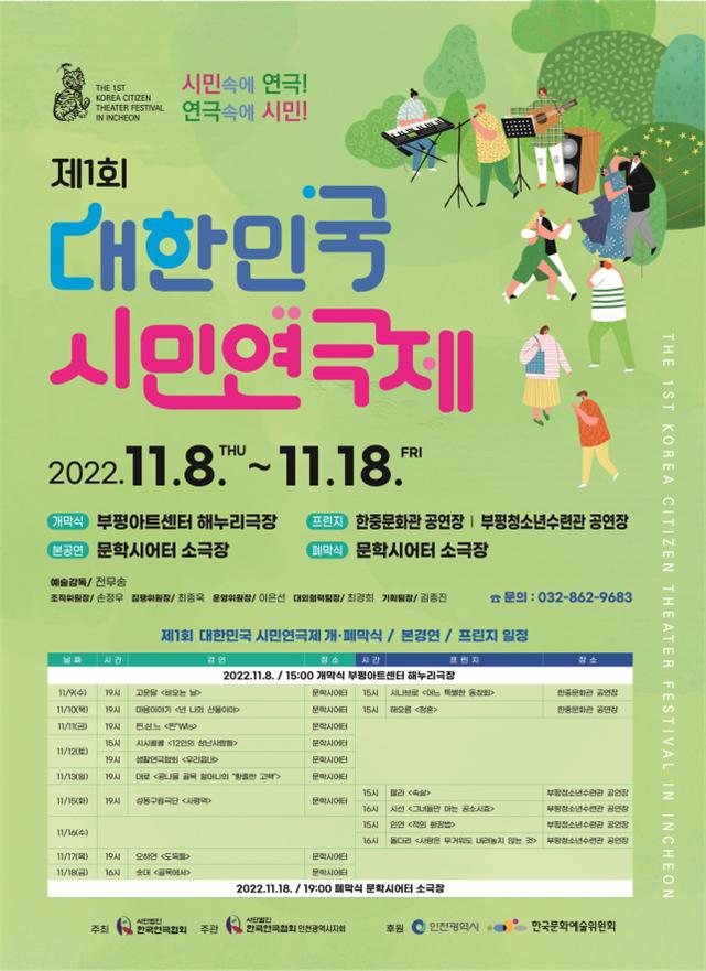 인천광역시가 후원하고 한국연극협회 인천시지회(이하 인천연극협회)가 주관하는 `제1회 대한민국 시민연극제`가 11월 8일부터 18일까지 인천시 일대에서 개최된다고 밝혔다.