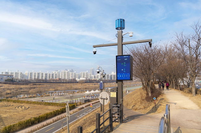 구로구는 스마트 기술과 행정 분야의 인프라를 통합해 주민 편의와 도시경관을 증진코자 관내 곳곳에 다기능 스마트폴을 추가 설치한다. 사진은 2021년 안양천에 설치한 `다기능 스마트폴` 모습(구로구 제공)