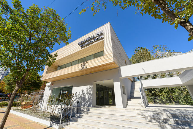 지상 2층 연면적 319㎡ 규모를 자랑하는 에코스페이스 연의’ 기존관은 어두웠던 외관을 밝고 화사한 열린 공간으로 조성했다. 1층은 화장실과 구의 환경녹지 정책을 홍보하는 인포센터로, 2층은 생태교육 지원 업무공간과 공원을 조망할 수 있는 옥상정원으로 구성됐다.