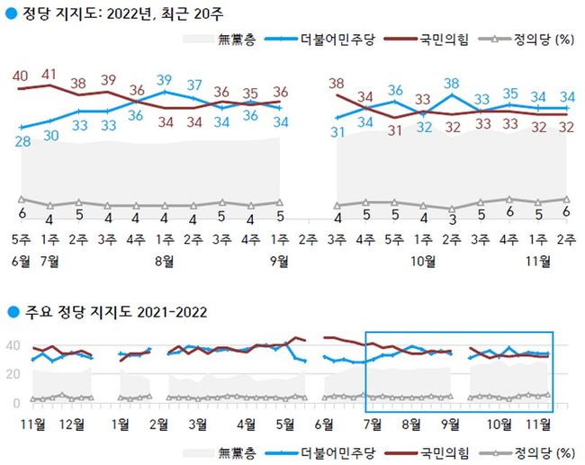 2022년 11월 둘째 주(8~10일) 현재 지지하는 정당은 더불어민주당 34%, 국민의힘 32%, 지지하는 정당 없는 무당(無黨)층 27%, 정의당 6%다.