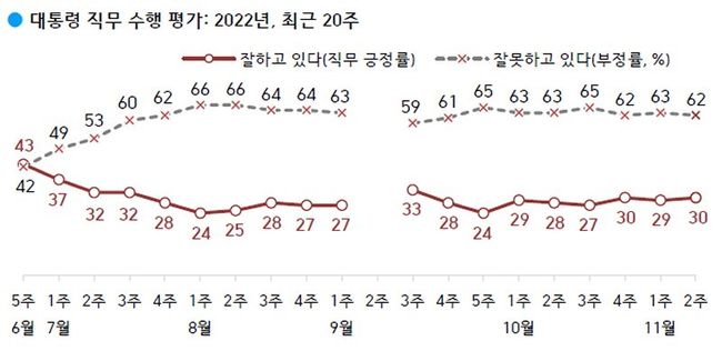 한국갤럽이 2022년 11월 둘째 주(8~10일) 전국 만 18세 이상 1,006명에게 윤석열 대통령이 현재 대통령으로서의 직무를 잘 수행하고 있다고 보는지 잘못 수행하고 있다고 보는지 물은 결과, 30%가 긍정 평가했고 62%는 부정 평가했으며 그 외는 의견을 유보했다.