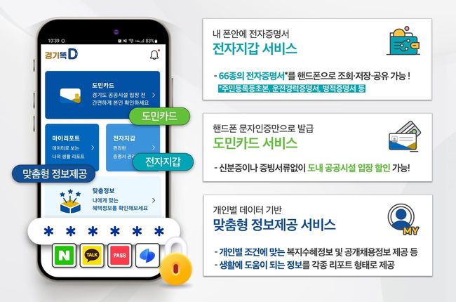 경기도가 공공마이데이터를 활용한 맞춤형 행정서비스 앱 `경기똑D`에 민간전자서명인 `간편인증` 서비스를 14일부터 도입한다.
