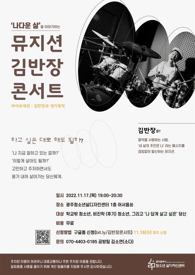 광주광역시는 수능일인 17일 청소년삶디자인센터(이하 ‘삶디센터’) 어서옵쑈에서 뮤지션 ‘김반장’을 초청해 진로콘서트를 개최한다고 밝혔다.