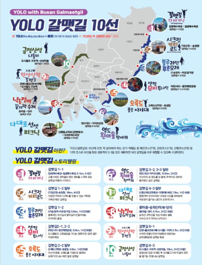 욜로(YOLO) 갈맷길이란, 부산에 오면 꼭 걸어봐야 하는 걷기 여행길로 코스당 반나절 이내로 완주할 수 있는 관광객 맞춤형 코스다. 해안코스 7개, 강변코스 1개, 산행코스 2개 등 총 10개 코스로 구성돼 바다와 산, 그리고 도심이 아름답게 공존하는 부산만의 특색있는 정취를 느낄 수 있다.