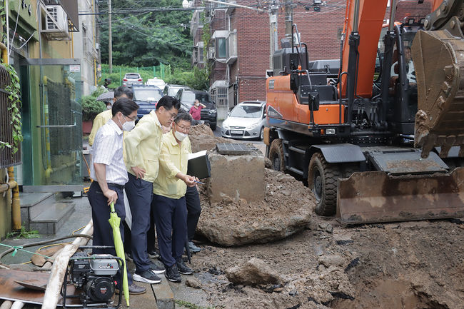 지난 8월, 집중호우로 발생한 신월동 씽크홀 복구 현장 점검중인 이 구청장