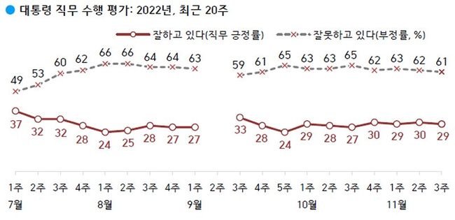 한국갤럽이 2022년 11월 셋째 주(15~17일) 전국 만 18세 이상 1,002명에게 윤석열 대통령이 현재 대통령으로서의 직무를 잘 수행하고 있다고 보는지 잘못 수행하고 있다고 보는지 물은 결과, 29%가 긍정 평가했고 61%는 부정 평가했으며 그 외는 의견을 유보했다.