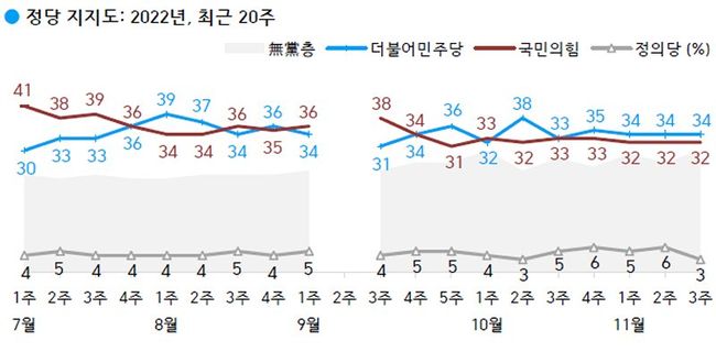 2022년 11월 셋째 주(15~17일) 현재 지지하는 정당은 더불어민주당 34%, 국민의힘 32%, 지지하는 정당 없는 무당(無黨)층 30%, 정의당 3%다.