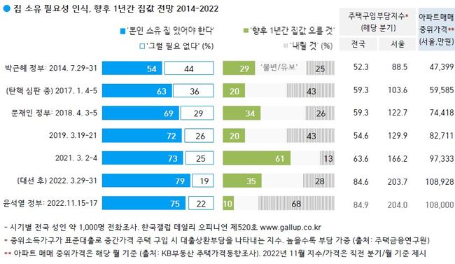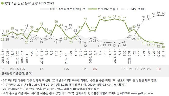 한국갤럽이 2022년 11월 15~18일 전국 만 18세 이상 1,002명에게 향후 1년간 집값 전망을 물은 결과 68%가 `내릴 것`이라고 답했다. `오를 것` 10%, `변화 없을 것` 16%, 의견 유보가 6%다.