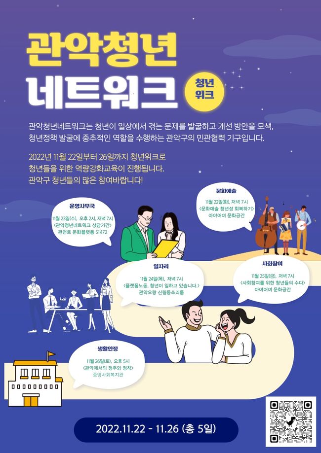 아울러 신림역 인근에 있는 관천로 문화플랫폼 S1472에서는 오후 2시부터 8시까지 청년들을 위한 네트워크 상담소를 운영한다. 네트워크에 참여하고 싶은 청년들에게 참여방법과 역할 등을 상담해 주고 많은 청년들이 네트워크에 참여할 수 있도록 독려할 계획이다.