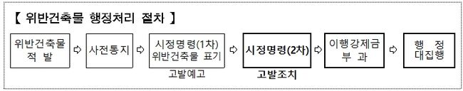 우선 위반건축물은 예외 없이 형사 고발한다. 기존 위반건축물은 개선을 위한 일정 기간을 안내한 후 개선이 안될 경우 고발하고, 신규 위반건축물은 단계별 행정조치 기준에 따라 1차 시정명령에도 개선하지 않을 경우 ‘선 고발 조치’ 한다.