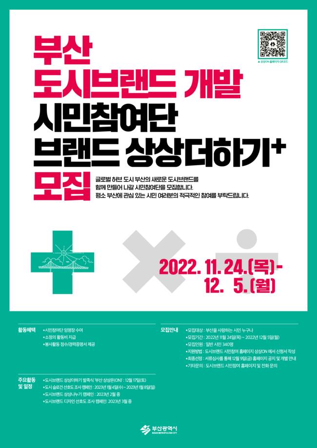 부산시는 부산의 새로운 도시브랜드에 시민의 상상력을 더하고, 시민 활동을 보장하기 위해 도시브랜드 시민참여단 ‘브랜드 상상더하기+’를 11월 24일(목)부터 12월 5일(월)까지 12일간 공개 모집한다고 밝혔다.