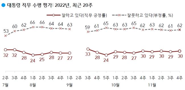 한국갤럽이 2022년 11월 넷째 주(22~24일) 전국 만 18세 이상 1,002명에게 윤석열 대통령이 현재 대통령으로서의 직무를 잘 수행하고 있다고 보는지 잘못 수행하고 있다고 보는지 물은 결과, 30%가 긍정 평가했고 62%는 부정 평가했으며 그 외는 의견을 유보했다(어느 쪽도 아님 2%, 모름/응답거절 5%).