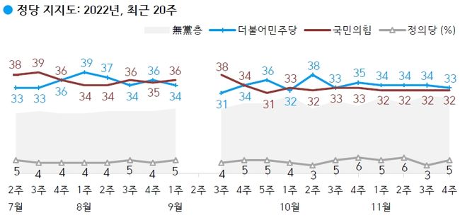 2022년 11월 넷째 주(22~24일) 현재 지지하는 정당은 더불어민주당 33%, 국민의힘 32%, 지지하는 정당 없는 무당(無黨)층 29%, 정의당 5%다.