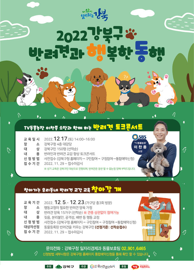 한편 구는 내달 17일 오후 2시 구청 대강당에서 ‘TV동물농장 이찬종 소장과 함께하는 반려견 토크콘서트’도 개최할 예정이다.