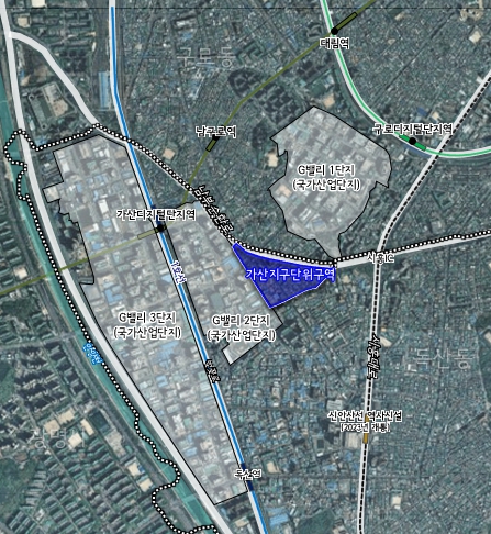 가산 지구단위계획구역은 남부순환로와 금천구 국가산업단지인 G밸리 1, 2단지와 인접한 지역이다.