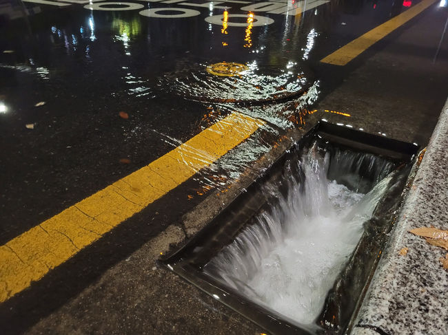 양천구, 낙엽이 제거된 빗물받이로 배수되고 있는 모습