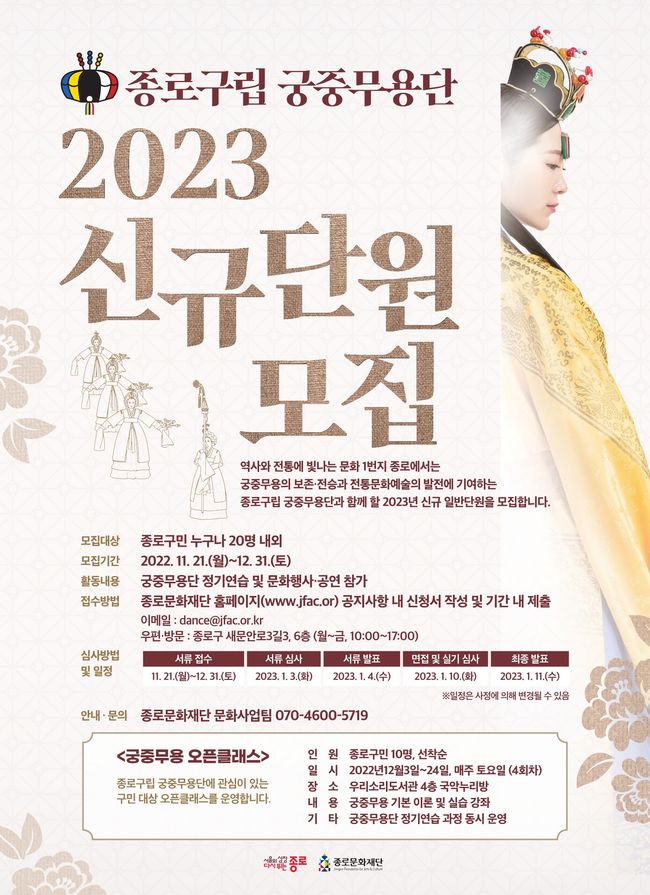 종로구가 아름다운 우리 궁중무용의 명맥을 잇고 전통문화예술 발전에 기여하기 위해 2023년 ‘종로구립 궁중무용단’ 신규단원을 공개 모집한다고 밝혔다.