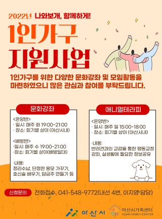 시는 급증하는 1인 가구를 위해 온양반, 배방반으로 나눠 △정리수납 교육 △단정한 용모 가꾸기 △호신술 배우기 △담금주 만들기 △애니멀 테라피 등 다양한 문화 강좌와 모임 활동 시범사업을 운영하고 있다. 참여 문의는 아산시 가족센터로 하면 된다.