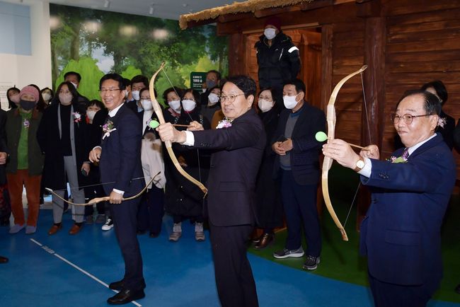 강기정 광주광역시장이 8일 오후 광산구 신창동 `마한유적체험관 개관식`에 참석해 박병규 광산구청장과 활쏘기 체험을 하고 있다.