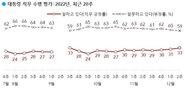 한국갤럽이 2022년 12월 둘째 주(6~8일) 전국 만 18세 이상 1,000명에게 윤석열 대통령이 현재 대통령으로서의 직무를 잘 수행하고 있다고 보는지 잘못 수행하고 있다고 보는지 물은 결과, 33%가 긍정 평가했고 59%는 부정 평가했으며 그 외는 의견을 유보했다(어느 쪽도 아님 3%, 모름/응답거절 5%).