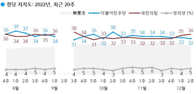 2022년 12월 둘째 주(6~8일) 현재 지지하는 정당은 국민의힘 36%, 더불어민주당 32%, 지지하는 정당 없는 무당(無黨)층 26%, 정의당 5%다.
