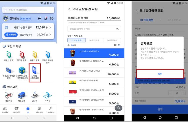 서비스를 이용하려면 ‘스마트 시티패스’ 앱에서 ‘포인트사용 → 모바일 상품권 교환’을 클릭하고, 필요에 따라 커피, 주유, 편의점 등 모바일 상품권으로 교환하면 된다. 교환한 상품은 문자 메시지나 카카오 알림톡으로 즉시 받아볼 수 있다.