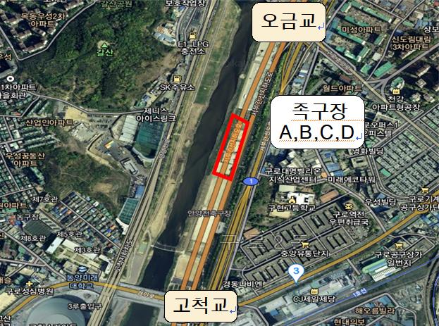 안양천 우안 고척교부터 오금교 구간에 위치한 족구장 A~D 4곳은 마사토로 조성돼 있어 먼지 날림, 안전사고 등에 취약했다. 이에 족구장을 이용하는 주민들의 만족도를 높이고자 족구장 개선 사업에 들어갔다.