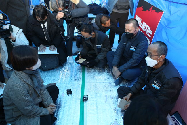 국가인권위원회 박진 사무총장이 오늘(12일) 국회 앞 화물연대본부 농성장을 방문해 공공운수노조 현정희 위원장과 화물연대본부 이봉주 위원장을 만났다.