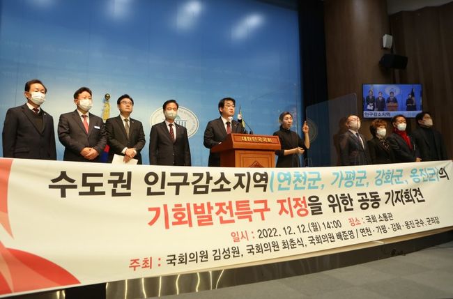 김성원 의원(동두천시 · 연천군), 최춘식 의원(포천시 · 가평군), 배준영 의원(중구 · 강화군 · 옹진군), 김덕현 연천군수, 서태원 가평군수가 12일 오후 서울 여의도 국회 소통관 기자회견장에서 기회발전특구 수도권 인구감소지역 예외조항 마련을 촉구하는 기자회견을 가졌다.
