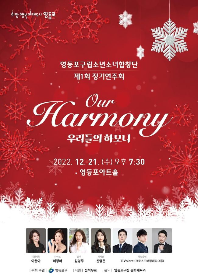 한편, 노래에 관심과 끼가 다분한 7~14세 어린이와 청소년 총 32명으로 구성된 ‘영등포구립소년소녀합창단’의 공연도 펼쳐진다. 오는 21일 오후 7시 30분에 “우리들의 하모니”라는 주제로 2019년 12월 창단 후 첫 정기연주회를 영등포아트홀에서 개최한다.