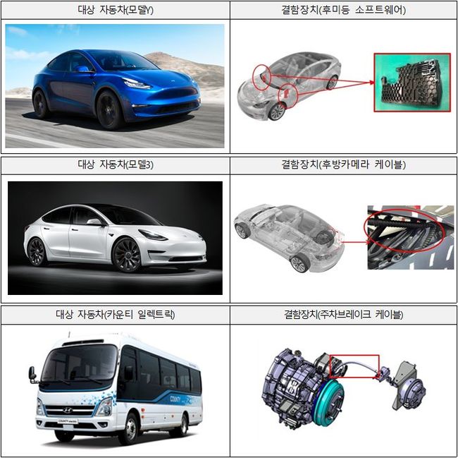 테슬라코리아 리콜 대상 자동차(위쪽2개), 현대 리콜 대상 자동차(라래쪽) (자료=국토교통부 제공)